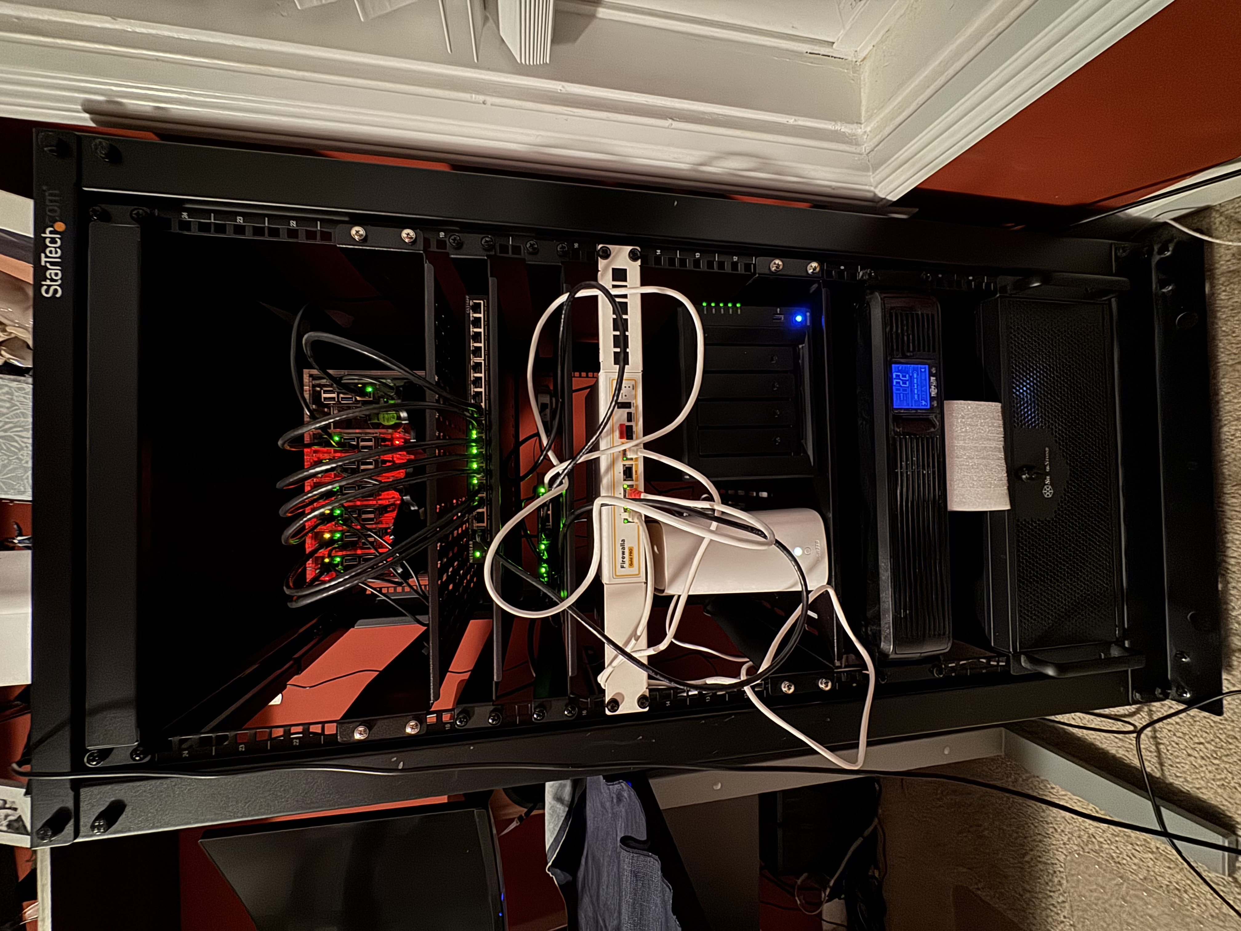 Above the UPS are the ISP modem and the NAS. Rack-mounted above them is the Firewalla Gold router (what an absolutely phenomenal piece of equipment). Directly above that is a 2.5Gbps unmanaged switch that connects the rest of the house (yeah that’s a pretty crucial switch); above that is a 16-port power-over-ethernet switch, dedicated exclusively to powering the rack in the final spot above that: the gorgeous acrylic “rack” for the Pi cluster.