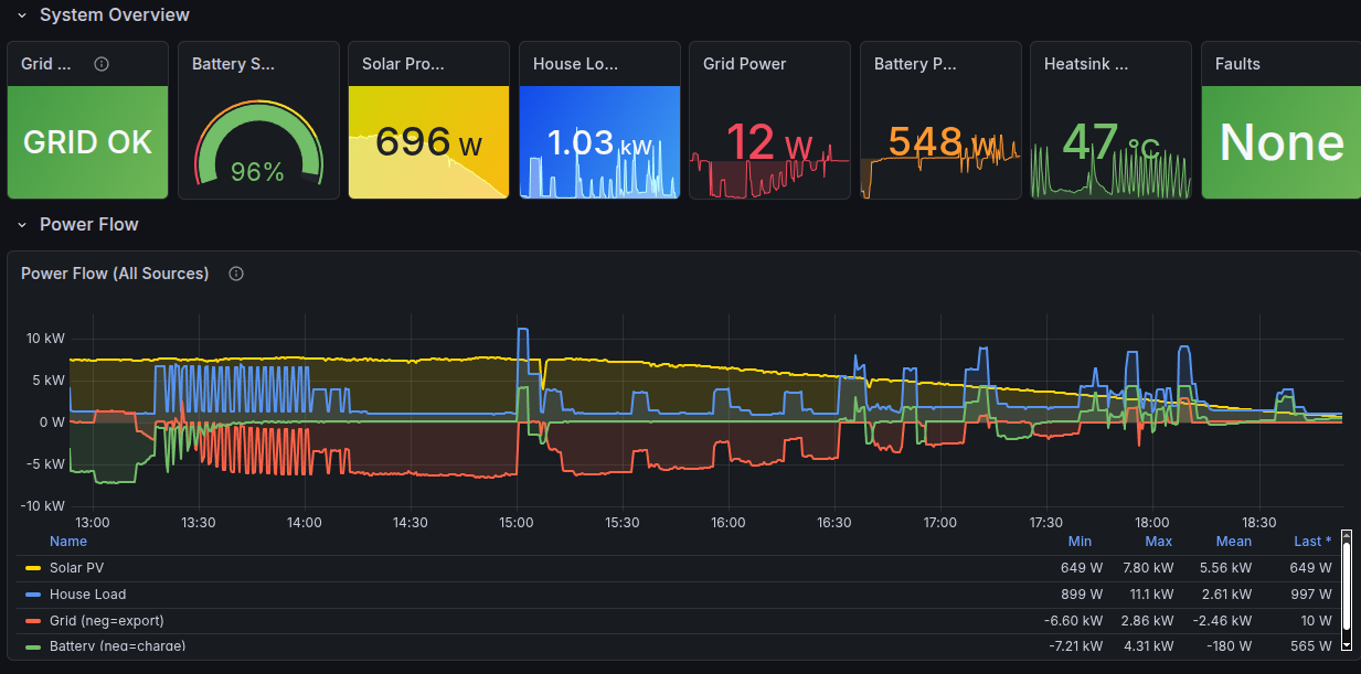 client.connect()Using this persistence pattern, you can repeatedly query the inverter using the client object. I then created a “service” (Linux lingo for “a job that gets executed repeatedly on a schedule”) so that my Python script would repeatedly ping the inverter for the values of dozens of its internal registers (grid voltage, frequency, battery charge, current, inverter power output, etc).